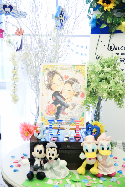お二人の好きなものや手作りのものを沢山飾り、ゲストの皆様をお迎えしました♪